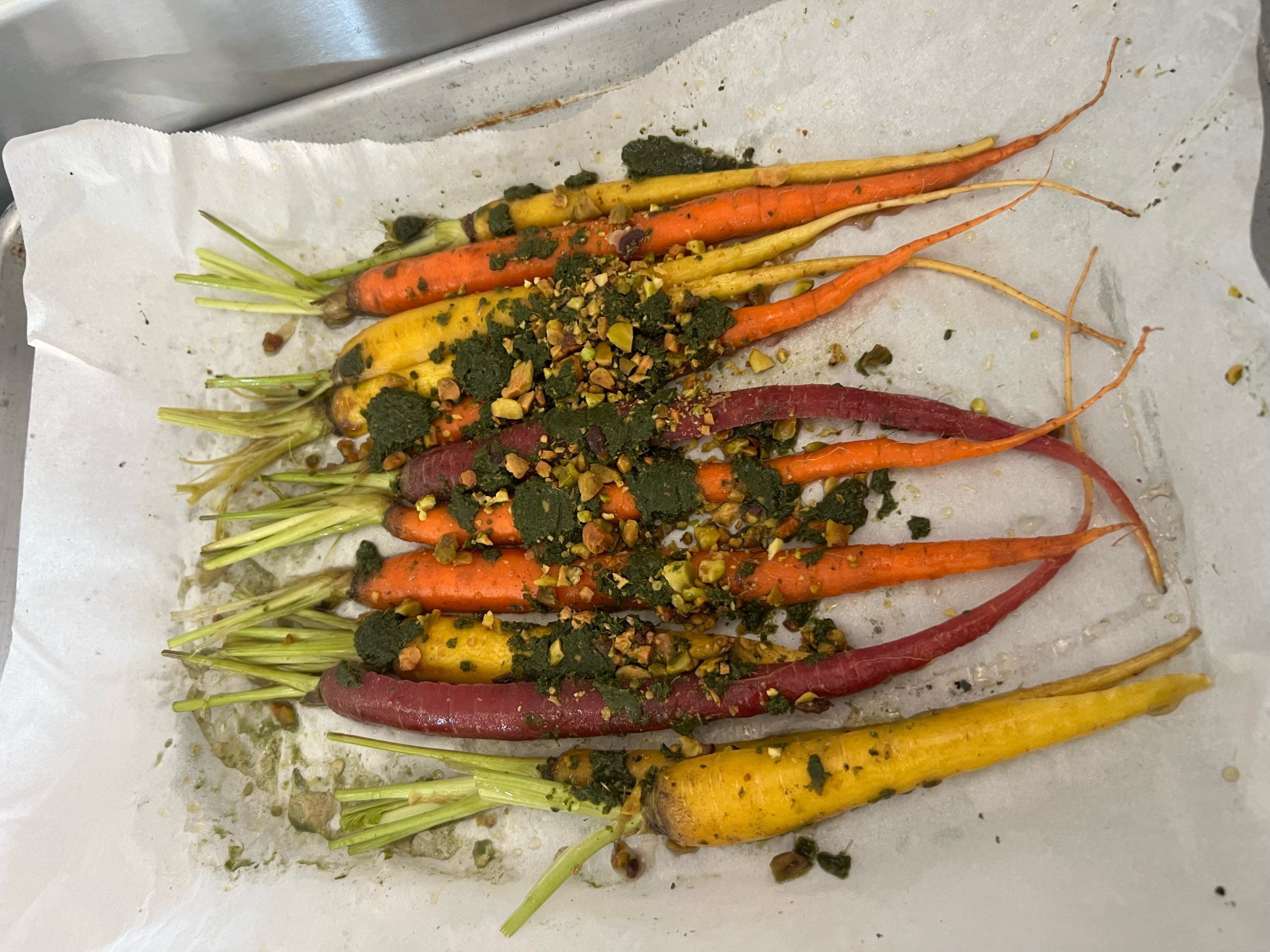 Maple glazed then topped with pistachio carrot top aromatic pesto creating a dynamic duo of sweet and savory- this harmonious side is as colorful as it is delicious!