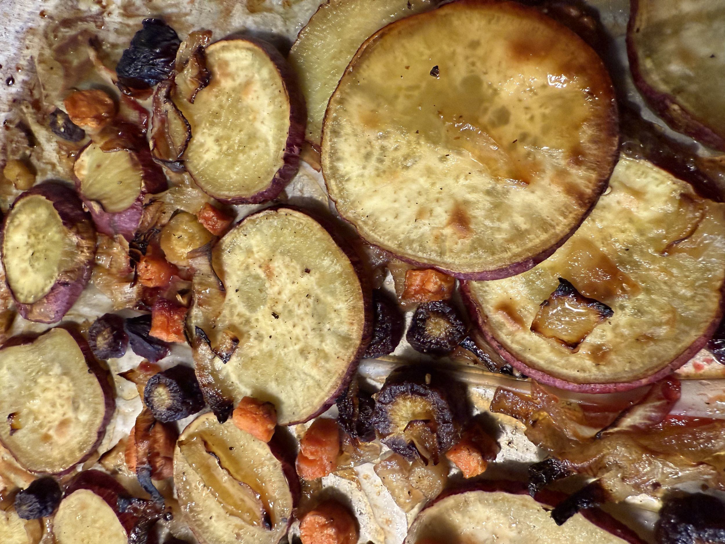 Sweet potato’s carrots onions and other roots veggies seasonal blend with sweet honey or spicy honey glaze