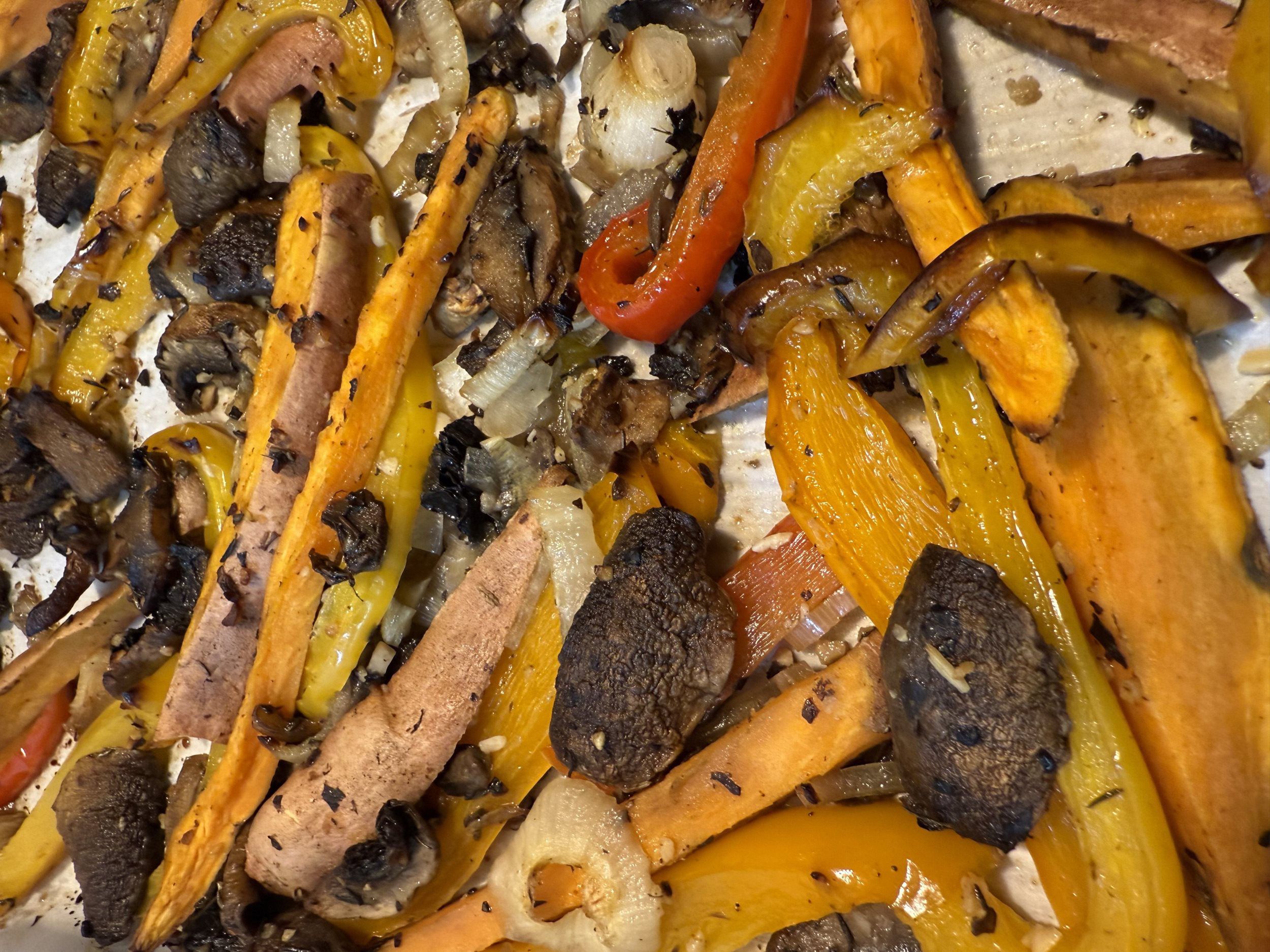 Mixed peppers mushrooms mixed carrots onions medley with delicious savory seasonings perfectly balanced and roasted in olive oil salt and pepper